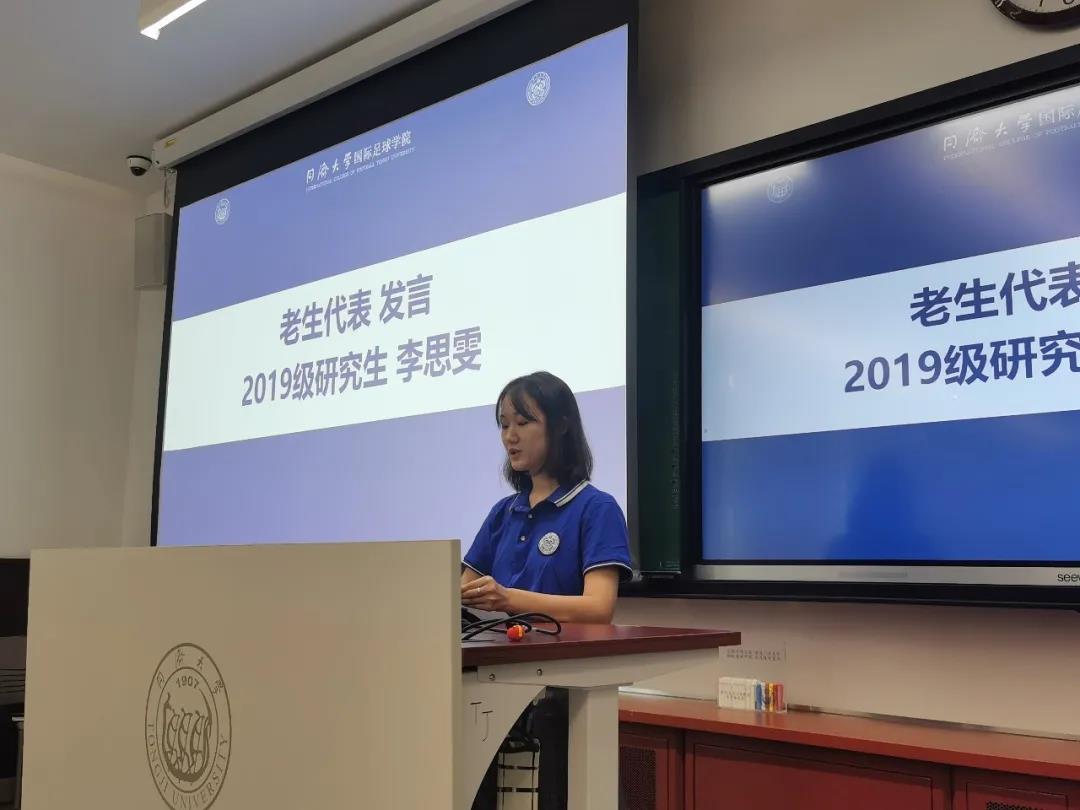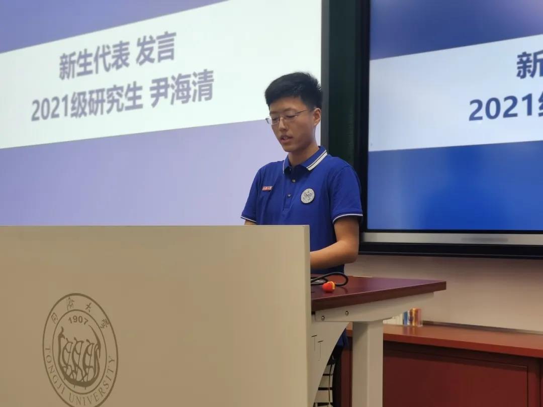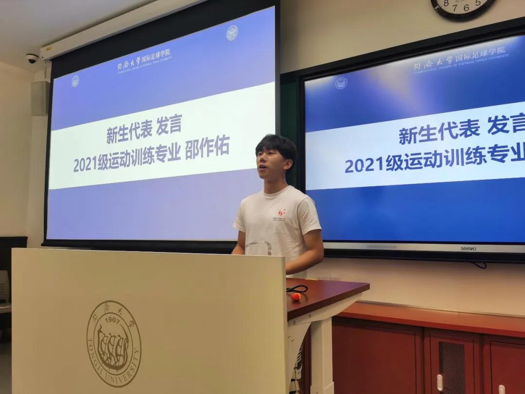 2021级研究生尹海清代表全体新研究生发言。他提到2021年是不平凡的一年,新冠疫情给足球产业带来了巨大的冲击,但机遇与挑战往往是并存的,在我国足球环境不断发展的大趋势下,我们身为新生力量应当用知识武装自己的大脑,找准定位,坚定信念,在中国足球的发展中发一分光,发一份热。