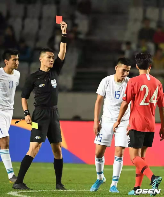 比赛进行到上半场40分钟,乌兹别克斯坦队15号队员因累计两张黄牌,被沈寅豪老师红牌罚下,韩国队凭借整体优势逆转最终获胜。