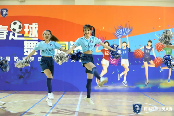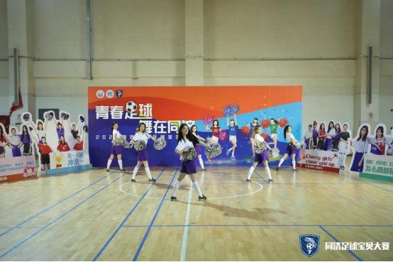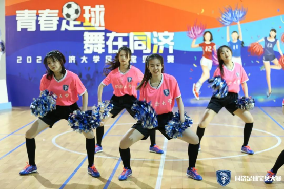 第一支登场的队伍是cherry girls,她们的口号是cherry girl cheer you up。虽然是第一支上场的队伍,但她们丝毫不怯场,四人配合默契,耀眼舞动的队员们以其特有的活力与魅力展示了足球宝贝的朝气蓬勃,也淋漓尽致的诠释了同济学子的风采。