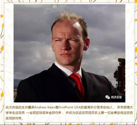 此次讲座的主讲嘉宾Andrew Kean是FirstPoint USA的首席执行官兼创始人, 辛辛那提大学学生运动员 —全额足球奖学金获得者, 并成为该运动项目历史上第一位全美最佳运动员奖项获得者。